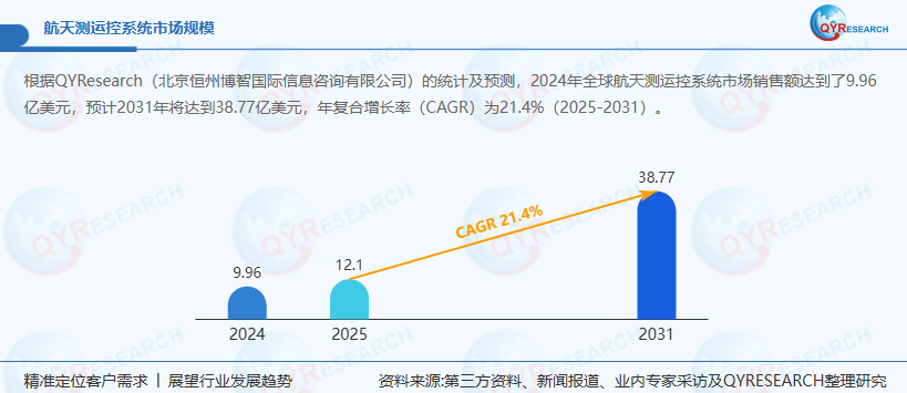 在全球航天产业加速商业化、军事化的浪潮中,航天测运控系统作为航天器与地面通信的 “神经中枢”,正成为保障太空任务成功的核心支撑。QYResearch 数据显示,2024 年全球航天测运控系统市场销售额已达 9.96 亿美元,预计 2031 年将飙升至 38.77 亿美元,2025-2031 年期间年复合增长率(CAGR)高达 21.4%。这一爆发式增长既源于卫星互联网、深空探测等任务的激增,更得益于测控技术的智能化升级,推动传统测控系统向全域感知、实时响应的综合保障体系演进。